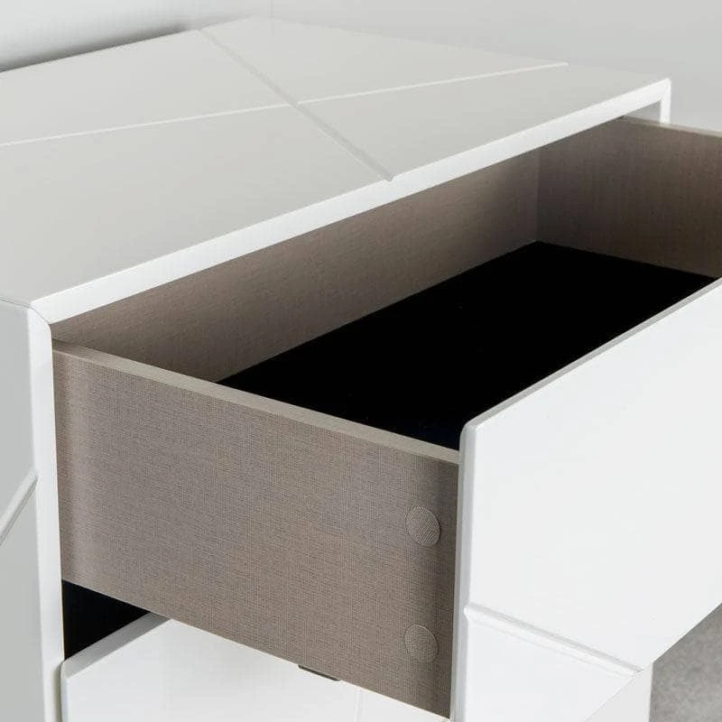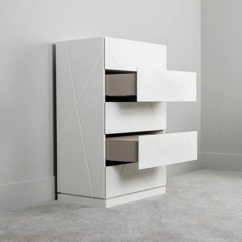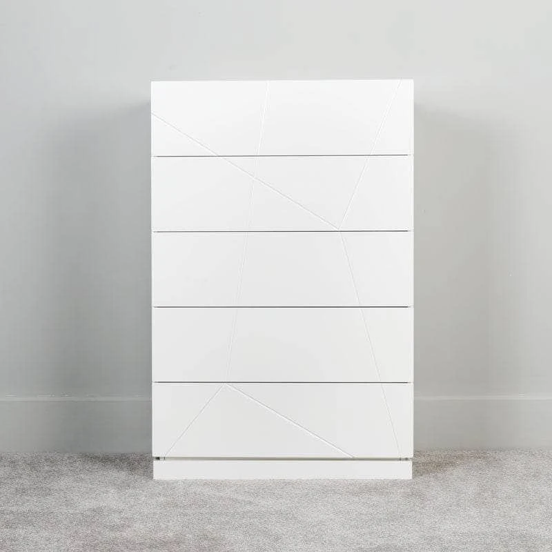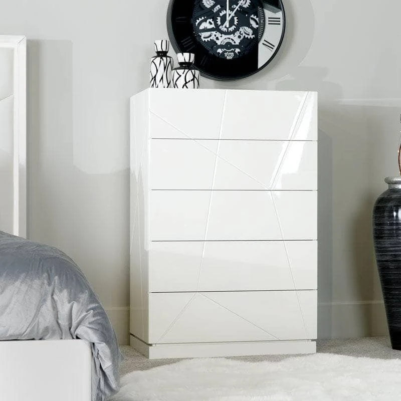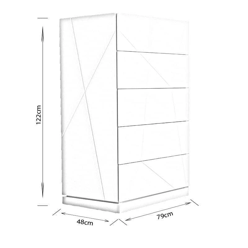 Organize your home in style with the Amalfi 5 Drawer Chest. Its sleek design and glossy finish bring a sophisticated feel to any space. Maximize storage capacity while adding a unique flair to your bedroom. The Amalfi 5 Drawer Chest is a seamless blend of contemporary design and practicality, creating a perfect synergy of form and function. Enjoy the luxurious modern look today!