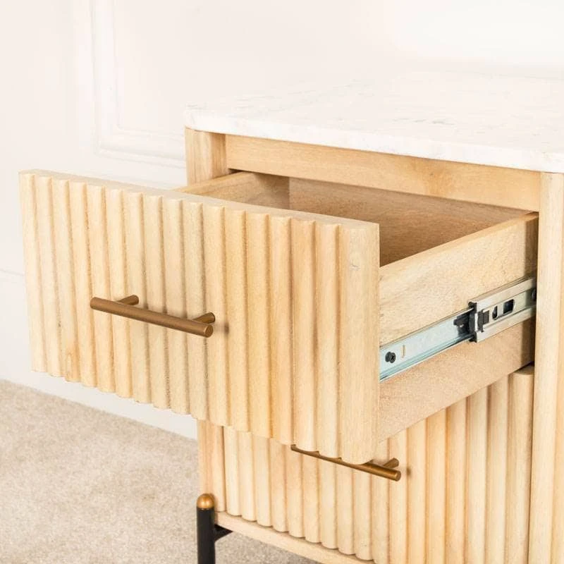 Crafted from rich mango wood and topped with a striking white marble surface, this bedside table is a stylish statement piece for any space. The two spacious drawers provide ample storage for all your essentials, while the gold handles add a glamorous finishing touch.