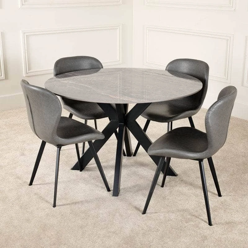 Transform your dining space with this elegant ceramic table, featuring a stunning grey marble-effect surface. With its contemporary design and black legs, this table adds sophistication and longevity to your area. The round table and four Athena Dining Chairs offer a chic grey and black colour scheme, radiating modernity and refinement. Striking the ideal combination of aesthetics and comfort the dining set makes the perfect addition to any home.