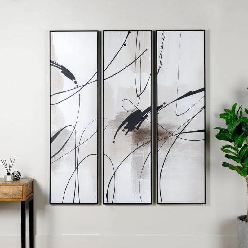 This trio of abstract paintings on canvas will make a modern and stylish addition to any home. The contemporary paintings are framed with black frames to give the artwork a sleek finish. A great choice for those looking to add a touch of artistry to their décor.