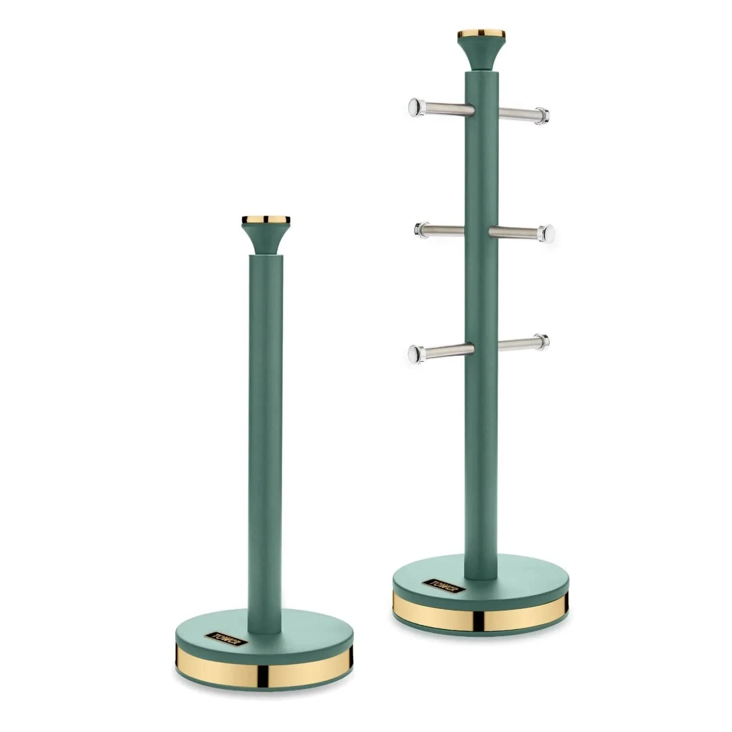 The Cavaletto Kitchen Towel Holder & Mug Tree Set in matte jade green is an ideal addition to any kitchen worktop. This set includes one piece towel pole and mug tree that can hold 6 mugs of different sizes. The stoppers at the end of the arms keep the mugs securely in place while the paper towel holder is suitable for any standard-size kitchen towel. Each piece has a solid base with a soft liner to prevent any marking on surfaces.