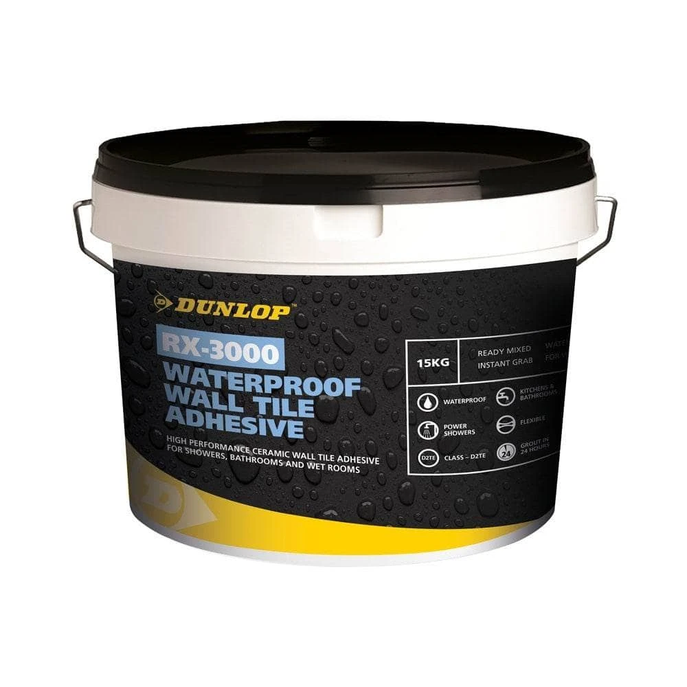 Dunlop Waterproof Wall Tile Adhesive 15Kg is a ready-mixed adhesive designed to fix ceramic and mosaic tiles in wet areas such as bathrooms, power showers and wet rooms. Its non-slip characteristics ensure secure bonding to flat interior wall surfaces, including plasterboard, rendering and tile surfaces. Perfect for damp areas, this waterproof adhesive reduces the need for battens.
