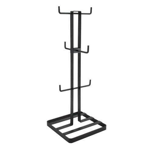 The Flat Iron Mug Tree is a stylish black holder that provides a convenient way to store up to six mugs. Its sleek design allows for easy storage and its durable construction ensures a long-lasting solution. An ideal accessory for any coffee enthusiast.