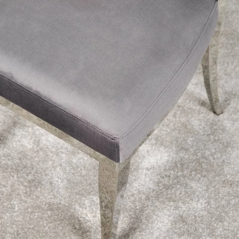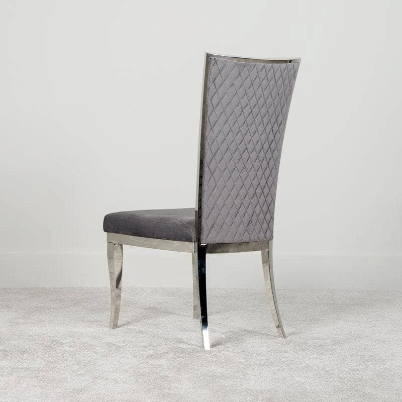 These chairs are a beautiful addition to any dining area, featuring a sleek grey fabric finished with mirrored chrome legs. The diamond-detailed backrest adds a touch of elegance, making these chairs not only comfortable but also visually appealing. Upgrade your dining area with the Galaxy Chairs in grey and chrome, and transform every meal into a stylish and comfortable affair.