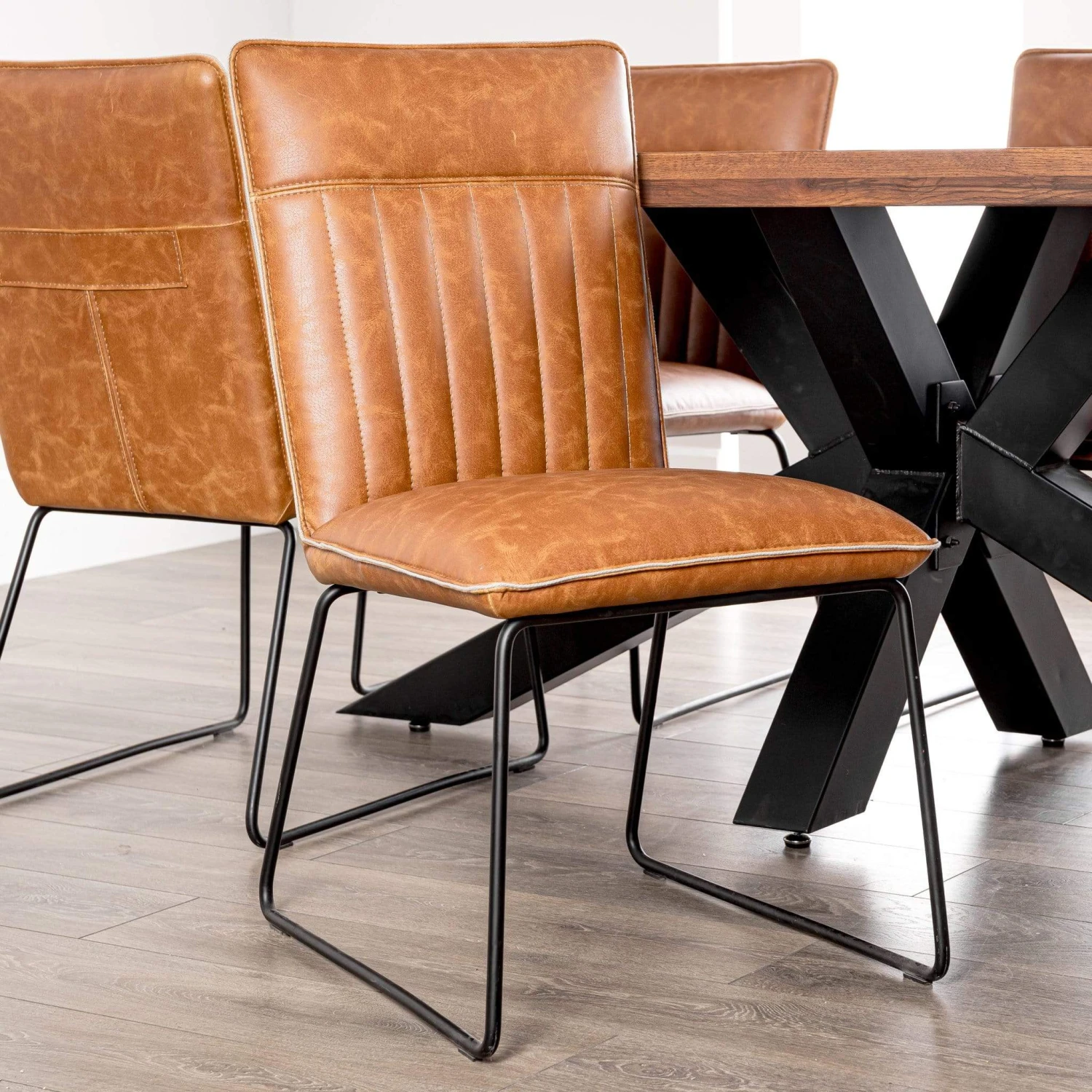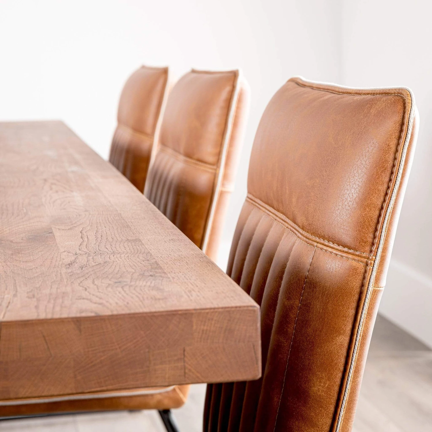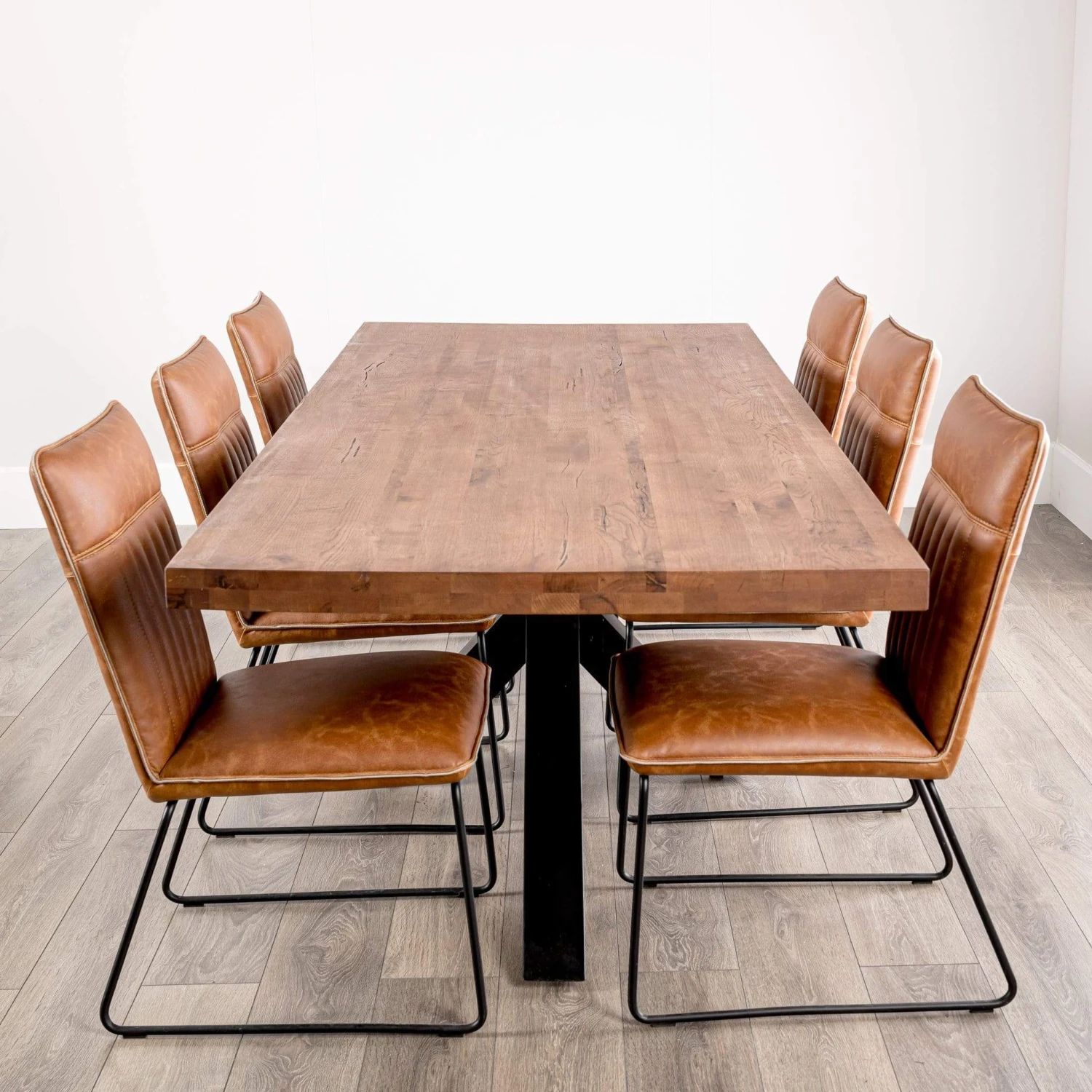 The Dining Set is perfect for families who might sometimes need extra space around the table to comfortably sits up to 8 people. The dining is complete with 6 vintage-looking Hooper tan leather dining chairs.