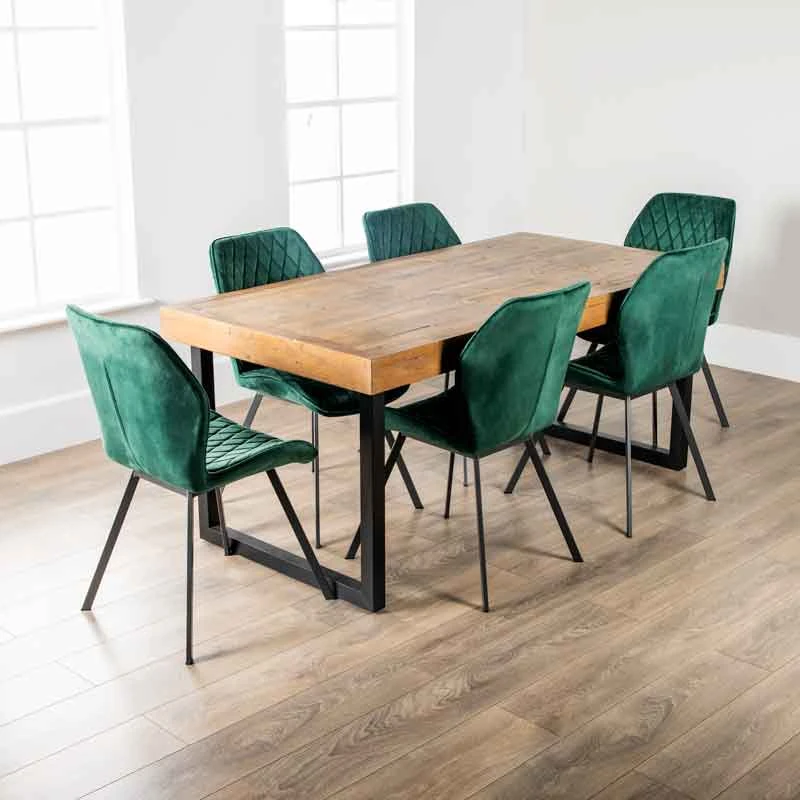 Our Lincoln Extending Table with 6 Vancouver Emerald Chairs brings stylish rustic vibes to your dining experience with this Lincoln Fixed Top Table. Make a lifestyle statement with a wood finish made from reclaimed materials. The black accent legs finish the oak feel, inviting all your guests to contemporary dining.