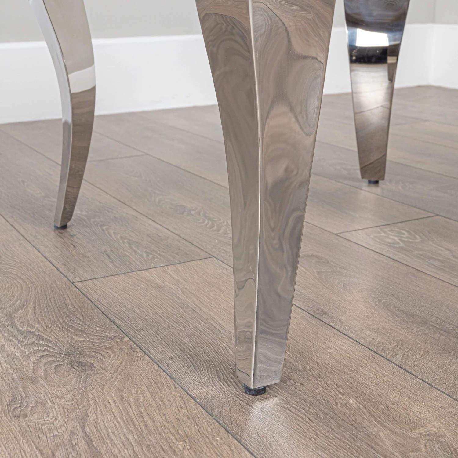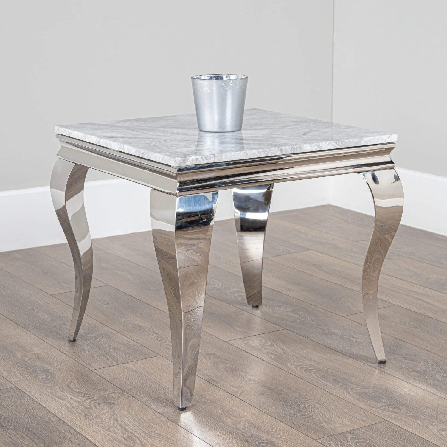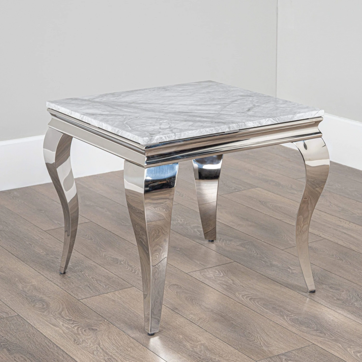Experience the beauty of the Louis Marble Lamp Table, featuring a breathtaking combination of white and grey monochromatic marble meticulously crafted into a stunning table. Its solid marble top is elegantly supported by sturdy, high shine stainless steel legs with a polished finish, delivering a truly extraordinary addition to any room.