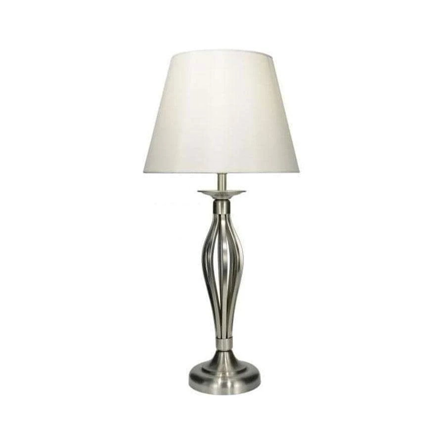This fabulous table lamp boasts a satin chrome base with an open metal work decoration, complete with a cream shade. Matching floor lamp available.