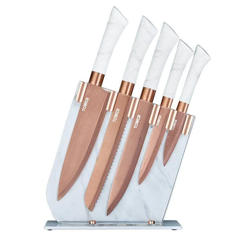 This Marble Rose Gold 5 Piece Knife Set adds contemporary elegance to your kitchen worktop. The Damascus patterned blades are constructed from a marble and rose gold for a stunning aesthetic and superior performance. Perfect for all your chopping needs, this set is a must-have for any cook.