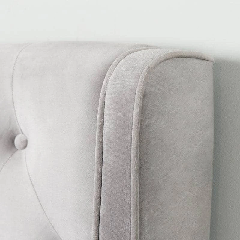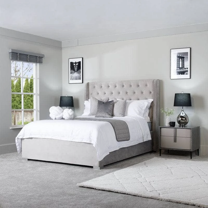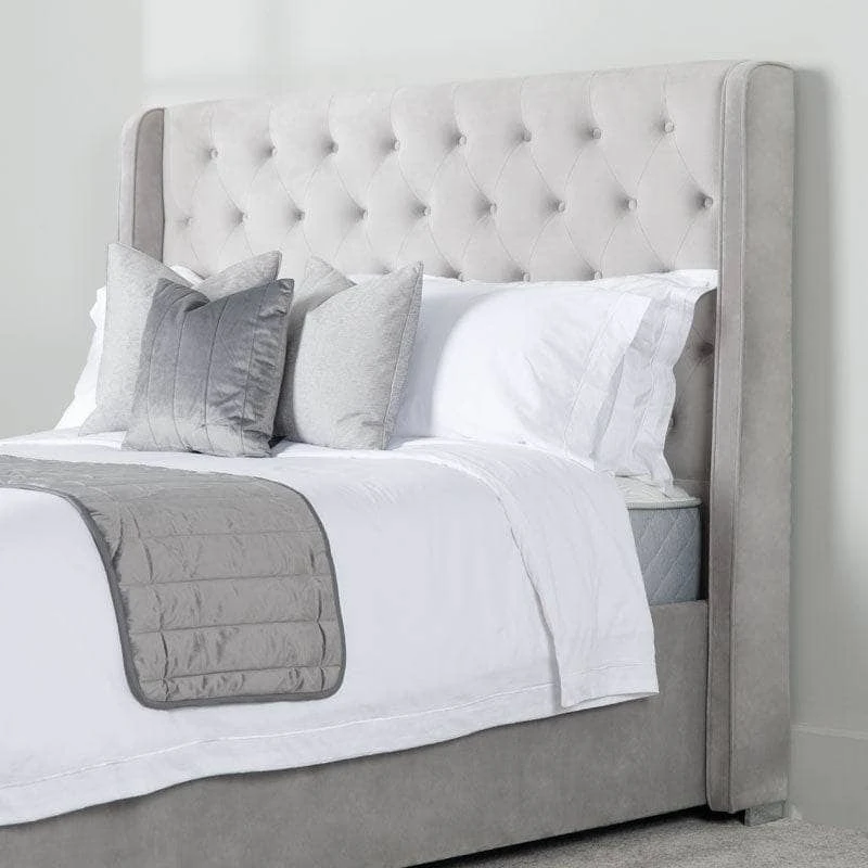 Relax with this Mayfair Silver King Size Bed, perfect for a great night’s sleep. Complete with a large grey headboard and simple design this is sure to impress in any modern home décor. A perfect balance of style and comfort, this bedframe is a great choice for those looking to round out a luxurious bedroom. The silver finish and sleek design will give any space an instant style upgrade.