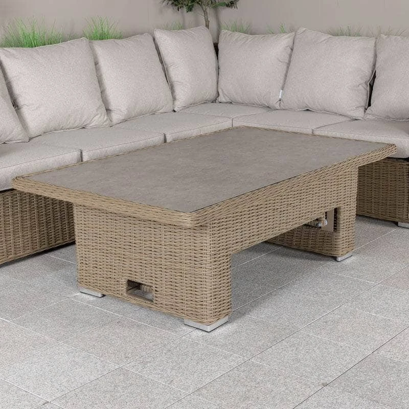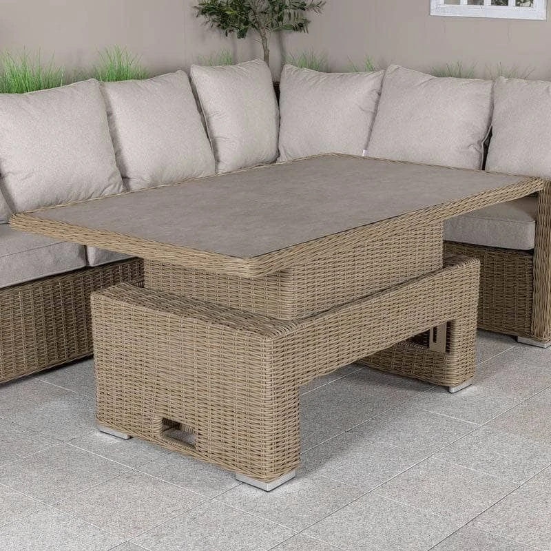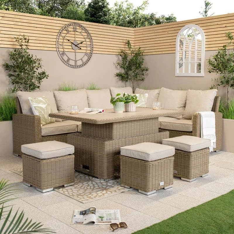 Create a stylish and inviting outdoor space with the Monaco Adjustable Table Garden Set in Natural. Designed for both dining and lounging, this versatile set includes a spacious corner sofa, three comfortable stools, and a height-adjustable table to switch effortlessly between coffee table and dining table settings.