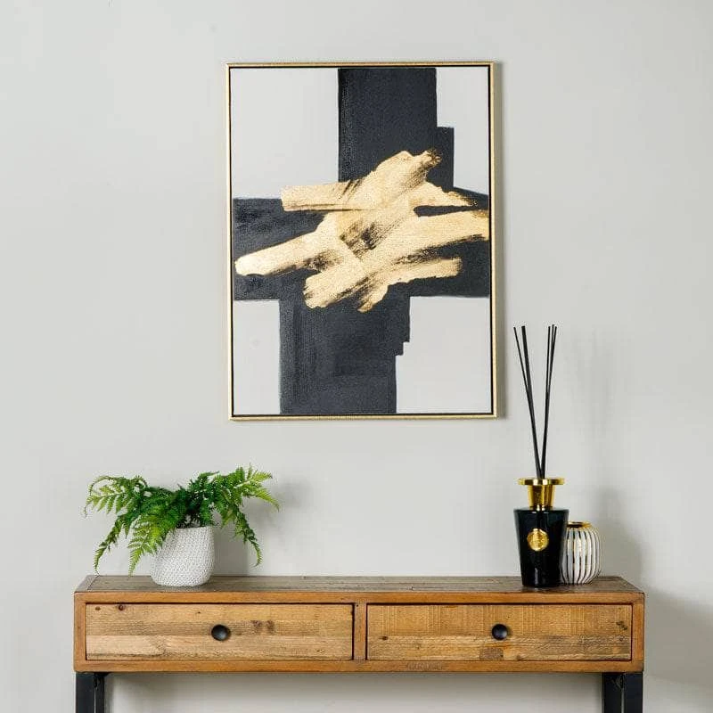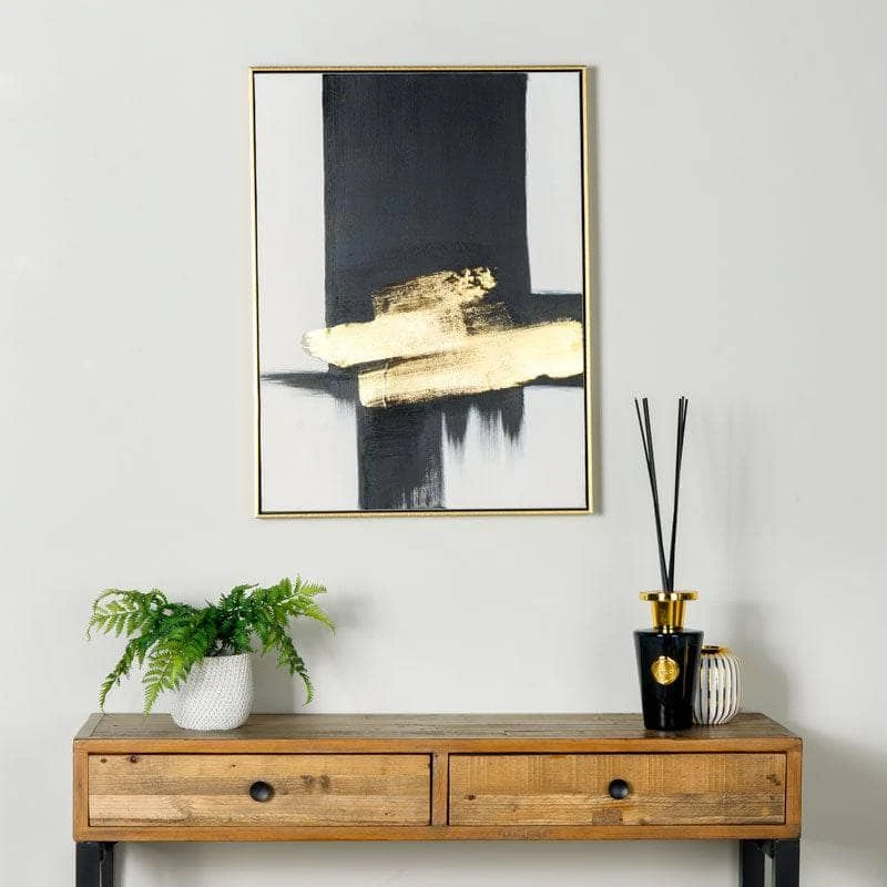 Bring modern elegance to your space with this Monochrome Abstract Framed Canvas. Featuring gold metallic brush strokes and a matching gold frame, this piece will be a luxurious statement piece for any home or office. Enjoy its contemporary abstract design for years to come.