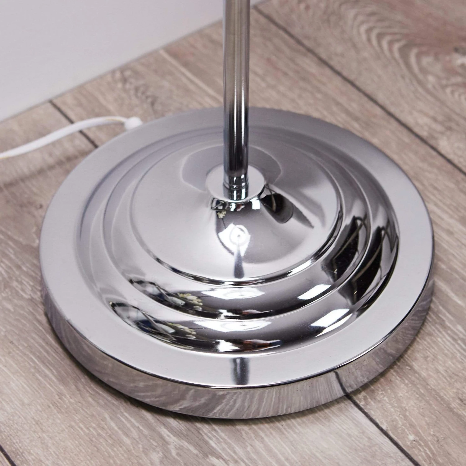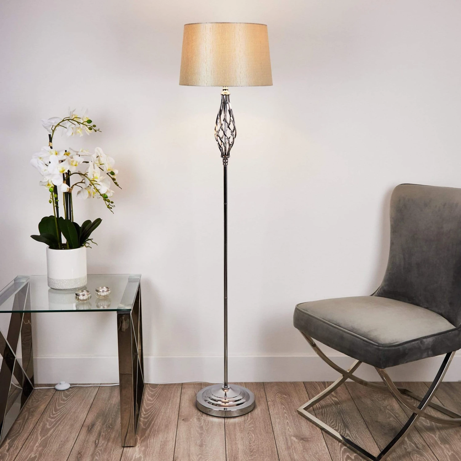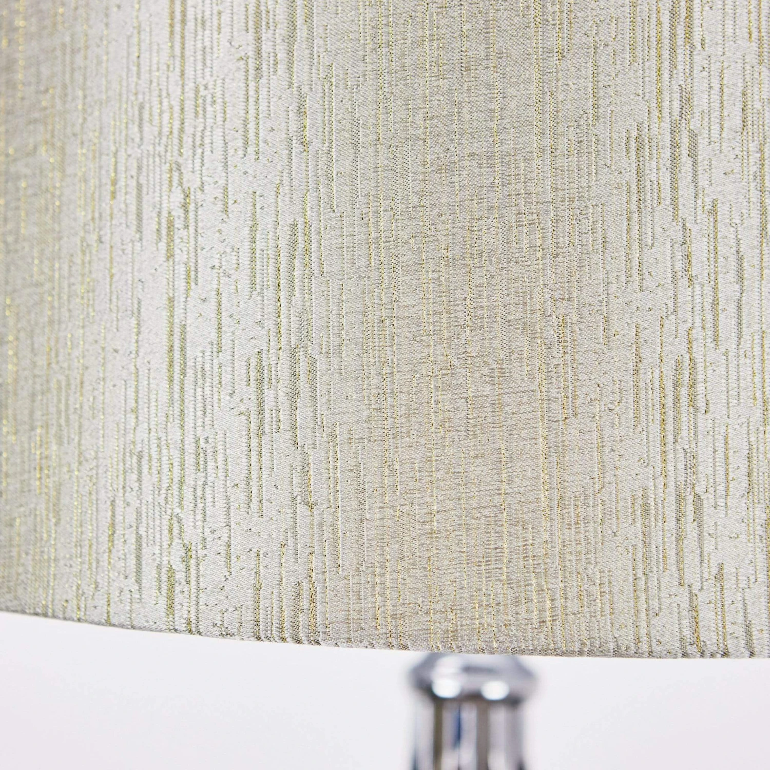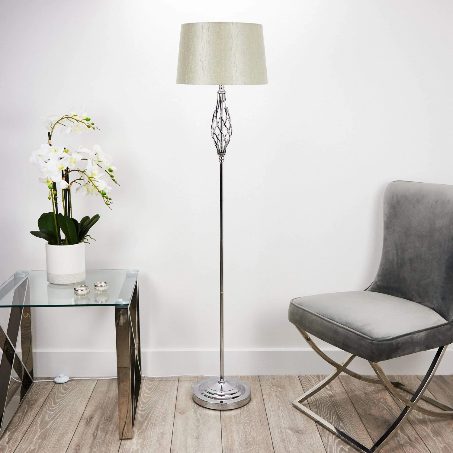 This stunning chrome metal floor lamp base has a unique twist design. Complete with a silver-coloured linen tapered cylinder shade, this lamp will be a lovely addition to any room.