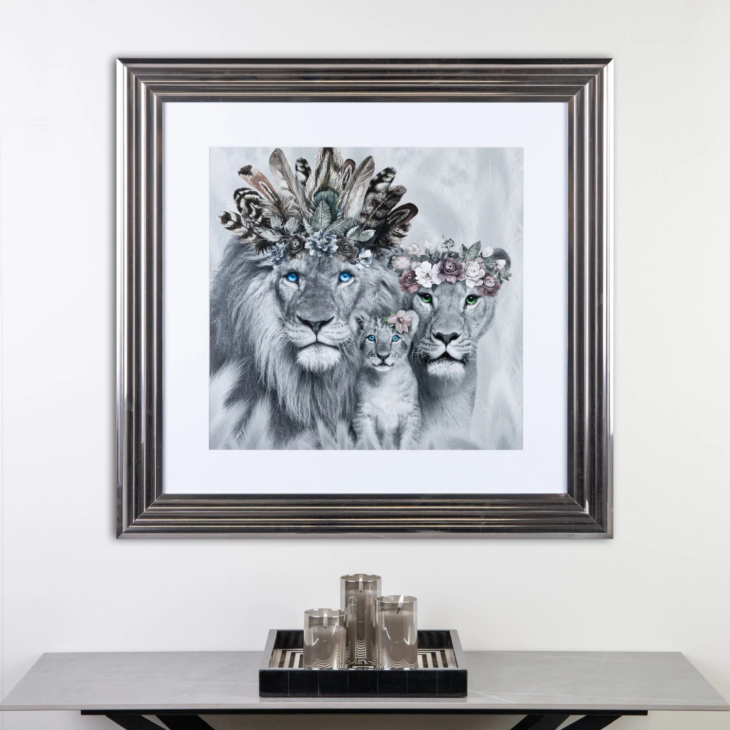 This beautiful, warm picture of a Lion family is a perfect way to decorate your home. An incredible piece of artwork that captures the spirit of the majestic lion. A royal art piece worthy of a royal home.